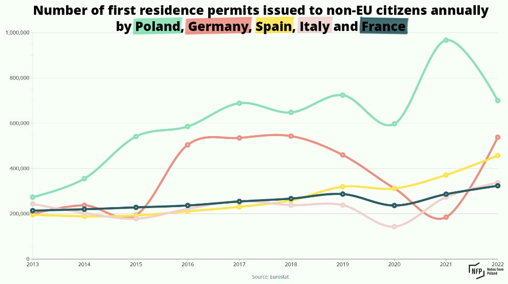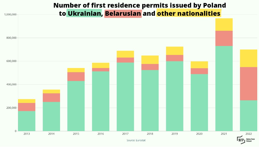 That has led to a record wave of immigration to Poland in recent years, with the country issuing the most first residence permits to immigrants from outside the EU among all member states for six years running. The majority of those arriving have been Ukrainians and there has also been a spike in the number of Belarusians since 2020.