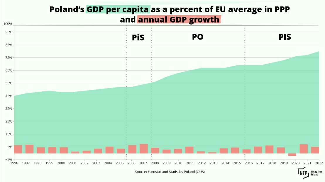 Voters going to the polls on 15 October will therefore in many regards be issuing a verdict on the track records of the two parties and their leaders. To get a perspective on that period, we have prepared 21 charts measuring Poland’s economic, social, cultural and democratic progress.