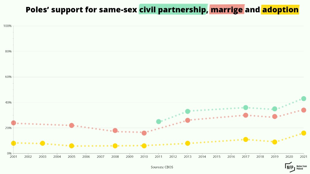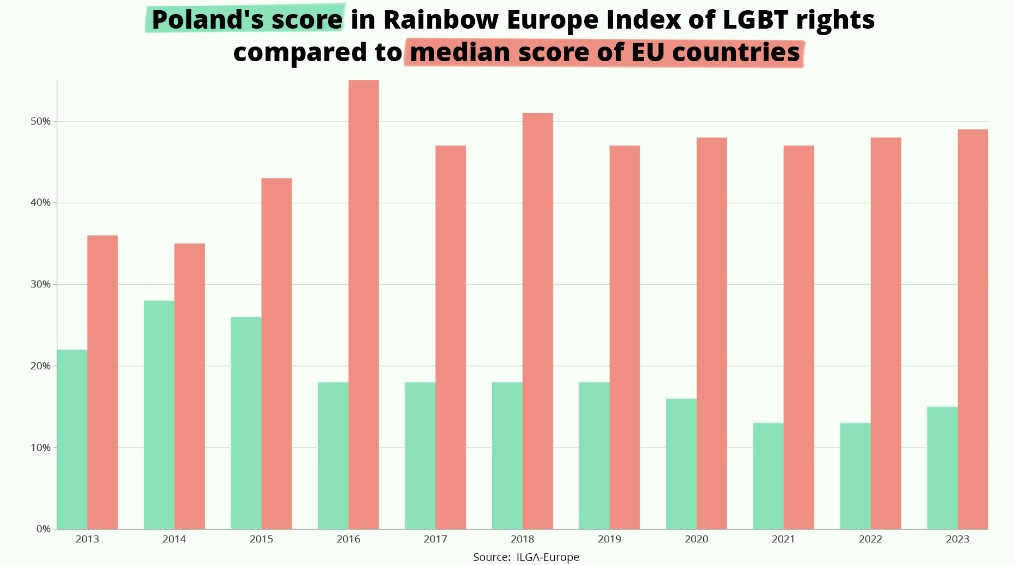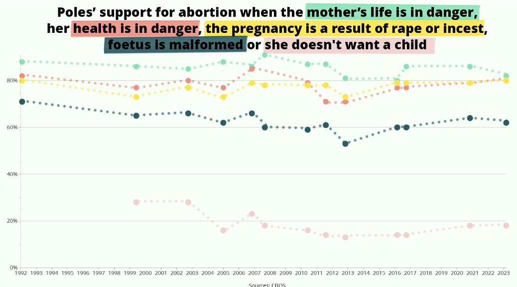 During the eight years of its rule, PiS has promoted a conservative social agenda, most notably through a vociferous campaign against what it calls “LGBT ideology” and through support for a near-total ban on abortion. But opinion polls indicate that Polish society as a whole is becoming more socially liberal.