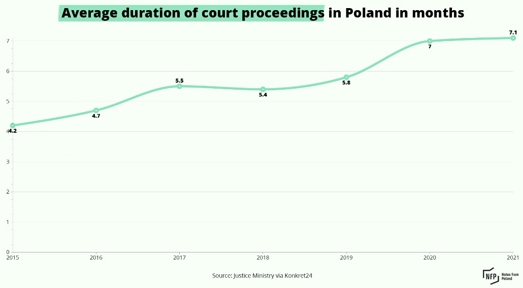 Although PiS has argued that judicial reforms are necessary to improve the functioning of the judiciary, data show that the average length of court proceedings has increased during its time in power.