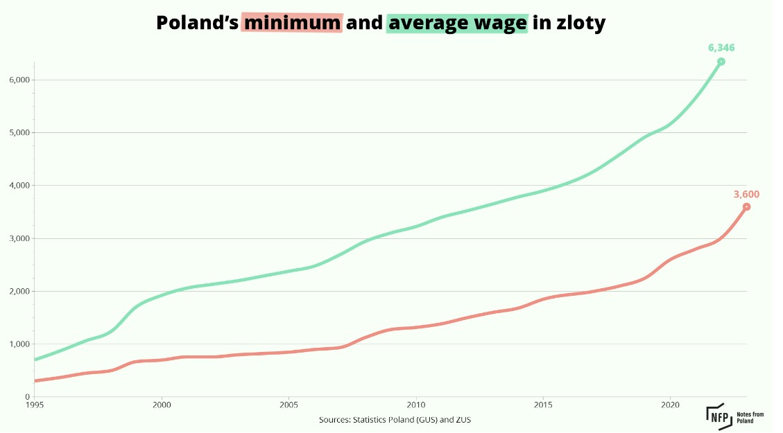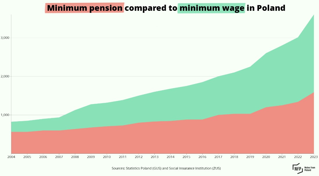 Although Poles have seen their wages rise over the past two decades, pensioners have lagged behind. In 2002, for example, the minimum pension was 70% of the lowest salary; by this year, that ratio had fallen to just over 44%.
