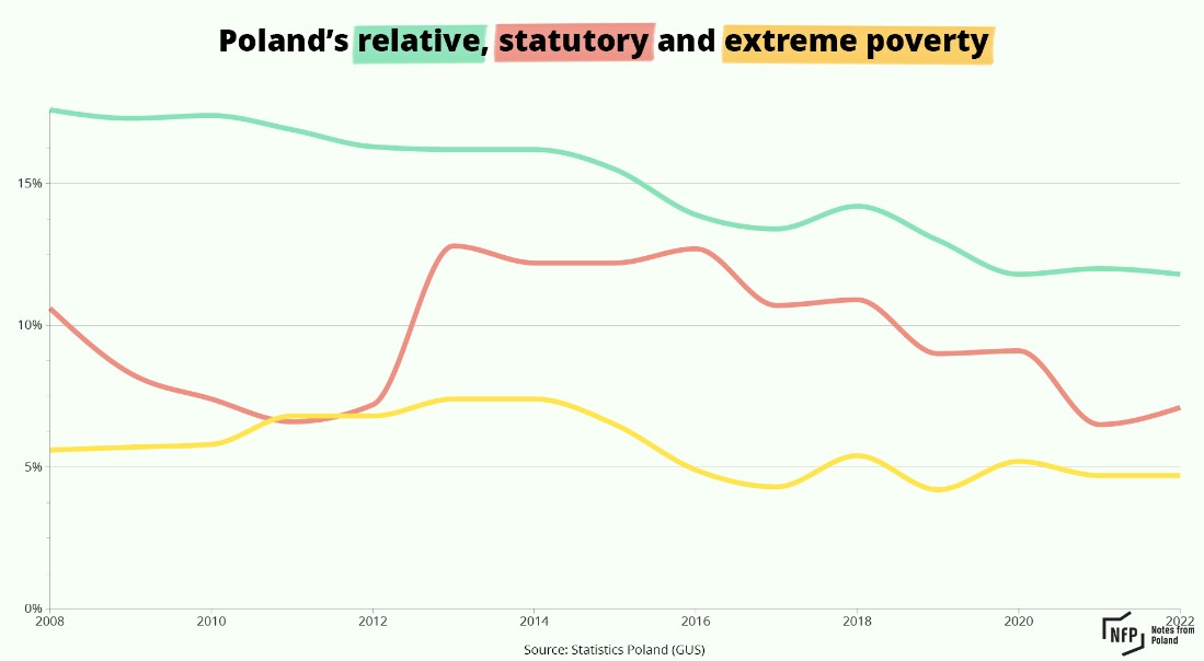 Poland has also seen a long-term decline in poverty, with the chart below showing the proportion of society classified as living in relative poverty (meaning household expenditure less than 50% of the average), statutory poverty (meaning household members qualify for social aid) and extreme poverty (meaning household expenditure is at a level deemed to endanger health).
