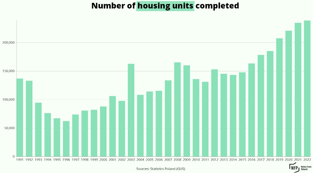 Amid Poland’s growing wealth, the country has also suffered a housing shortage, with estimates suggesting that the country lacks as many as 1.5 to 2 million dwellings. However, recent years have seen a rise in the number of new housing units completed.