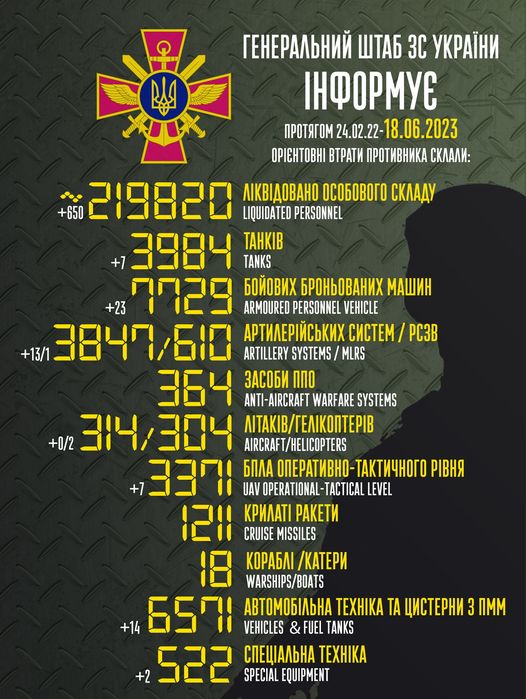 The adversary focuses its main efforts on Lyman, Bakhmut, Avdiivka, and Mar’inka axes, with 26x combat engagements taking place during the day of June 17.